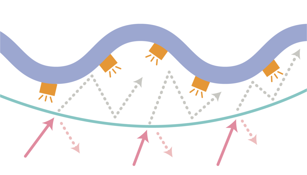 パネルの波打ちによりLEDとの距離にムラが生まれ、森の木漏れ日のような自然な光のゆらぎを創出します。