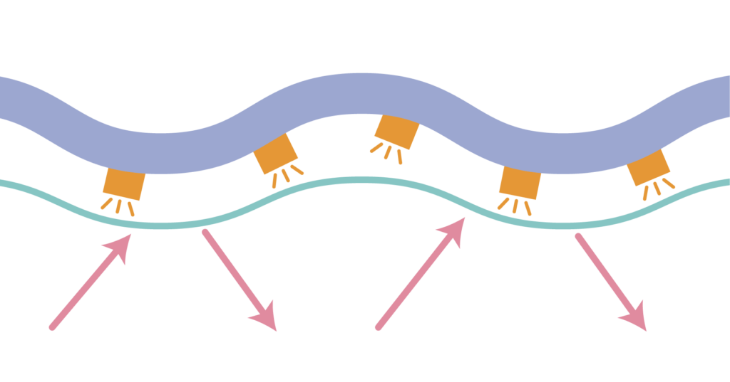 集中モードでは、上層が波打って空気層と表面積が増えるため吸音性が高まる。LEDと下層に距離のムラができ、光にグラデーションができる。